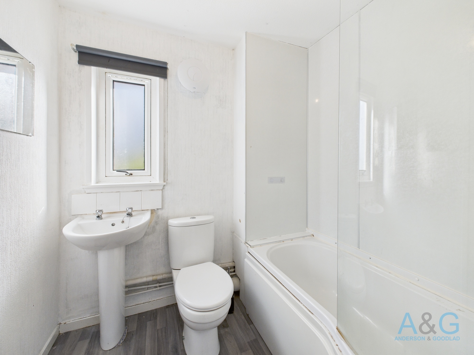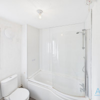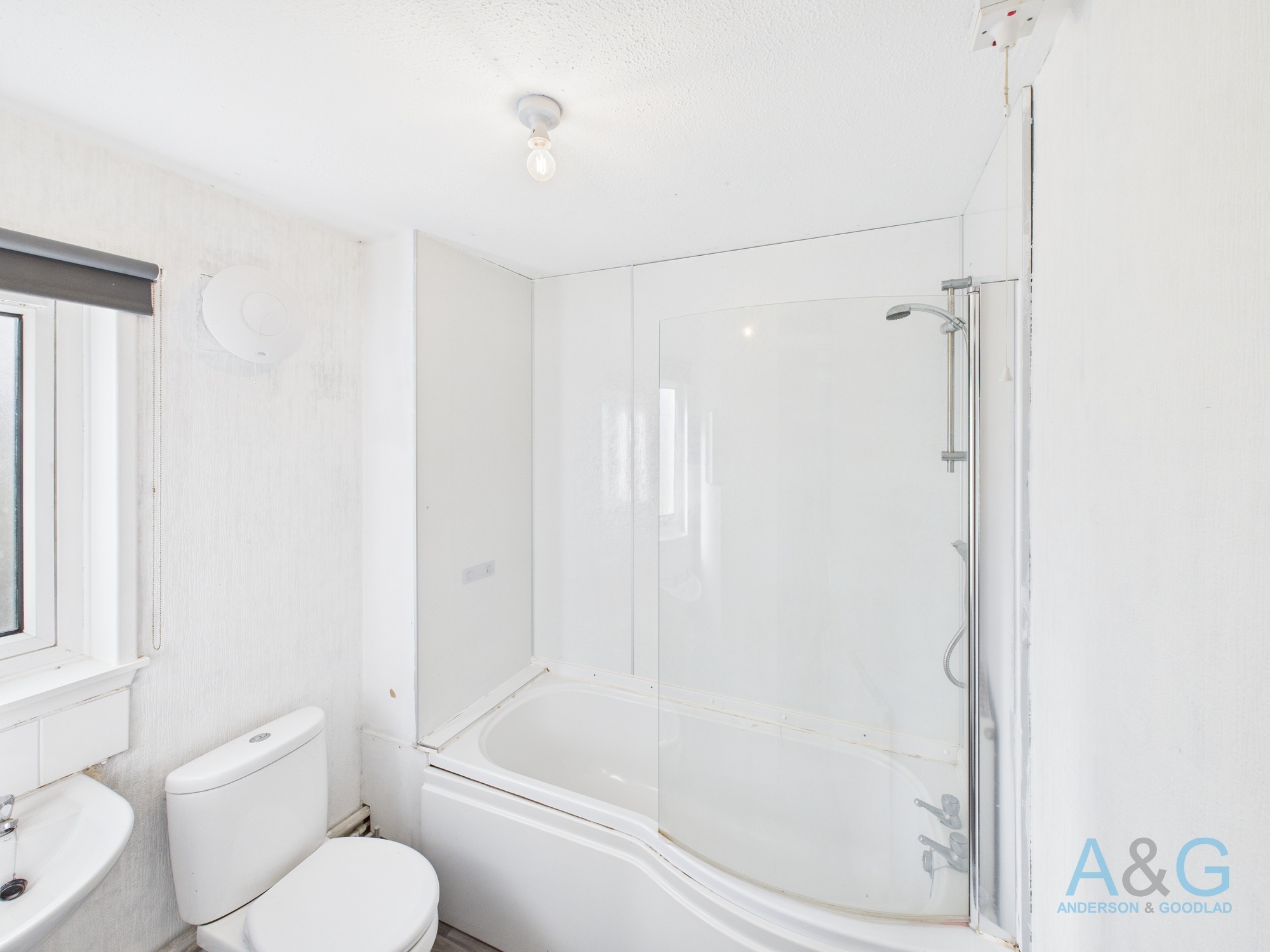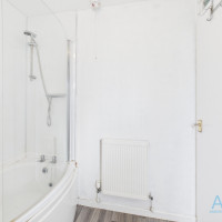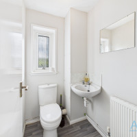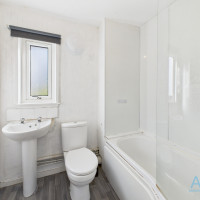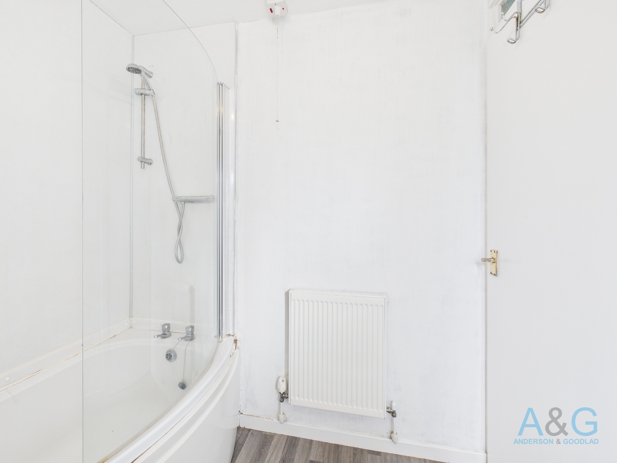 The well-appointed Kitchen has a window overlooking the front garden to the north. Contains shaker style wood effect, soft-close fitted cabinets and imitation marble worktop (all in good condition), stainless steel sink, extractor fan, Bloomberg washing machine, two single sockets, four double sockets, boost heating control, radiator and vinyl flooring.