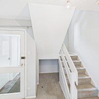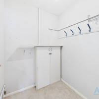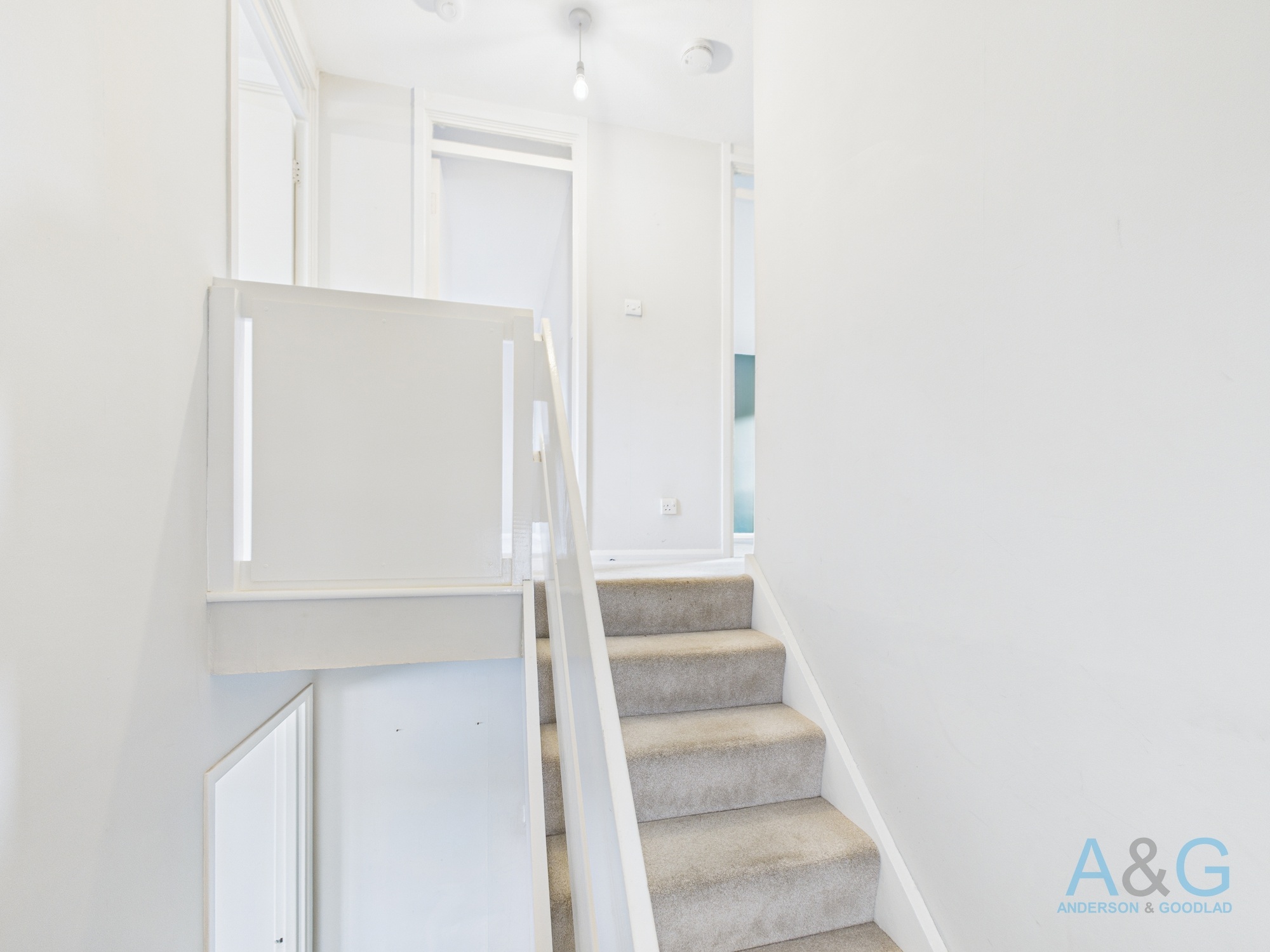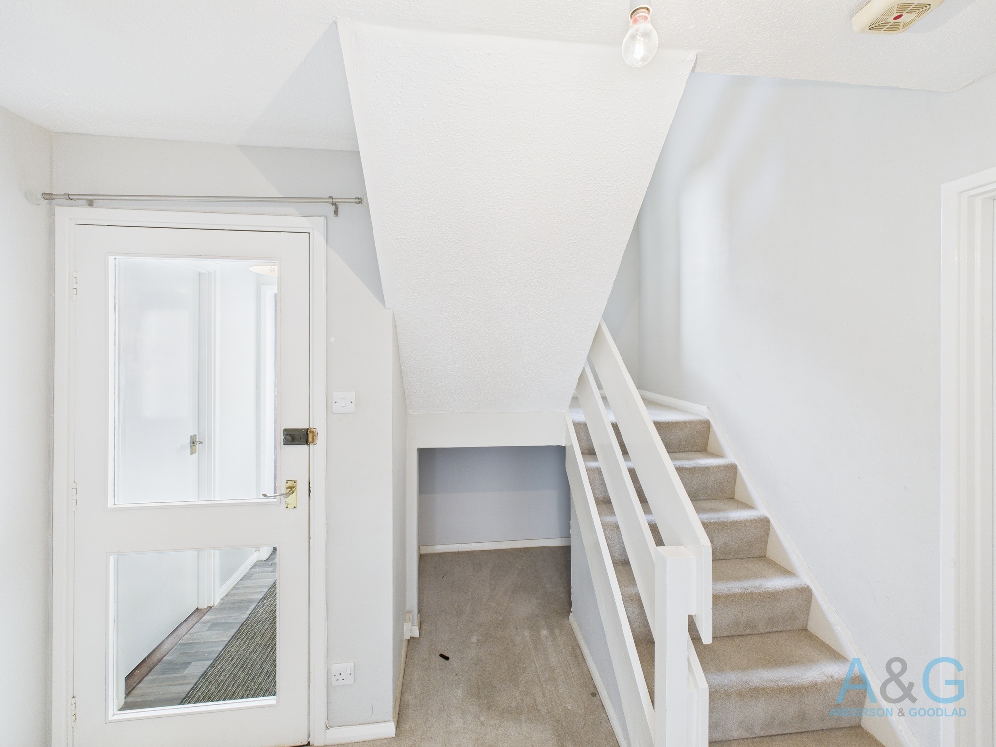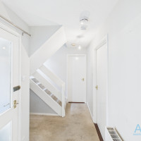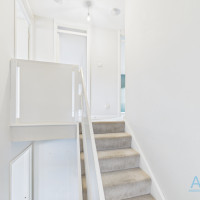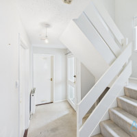 A west facing window provides natural light into the Staircase that leads to the first floor Landing, which contains a single socket and smoke/heat alarm. There is a Linen Closet (0.93m x 0.49m) with shelving and Cupboard (2.12m x 0.81m) containing the Megaflow hot water tank and access to the loft which is insulated.