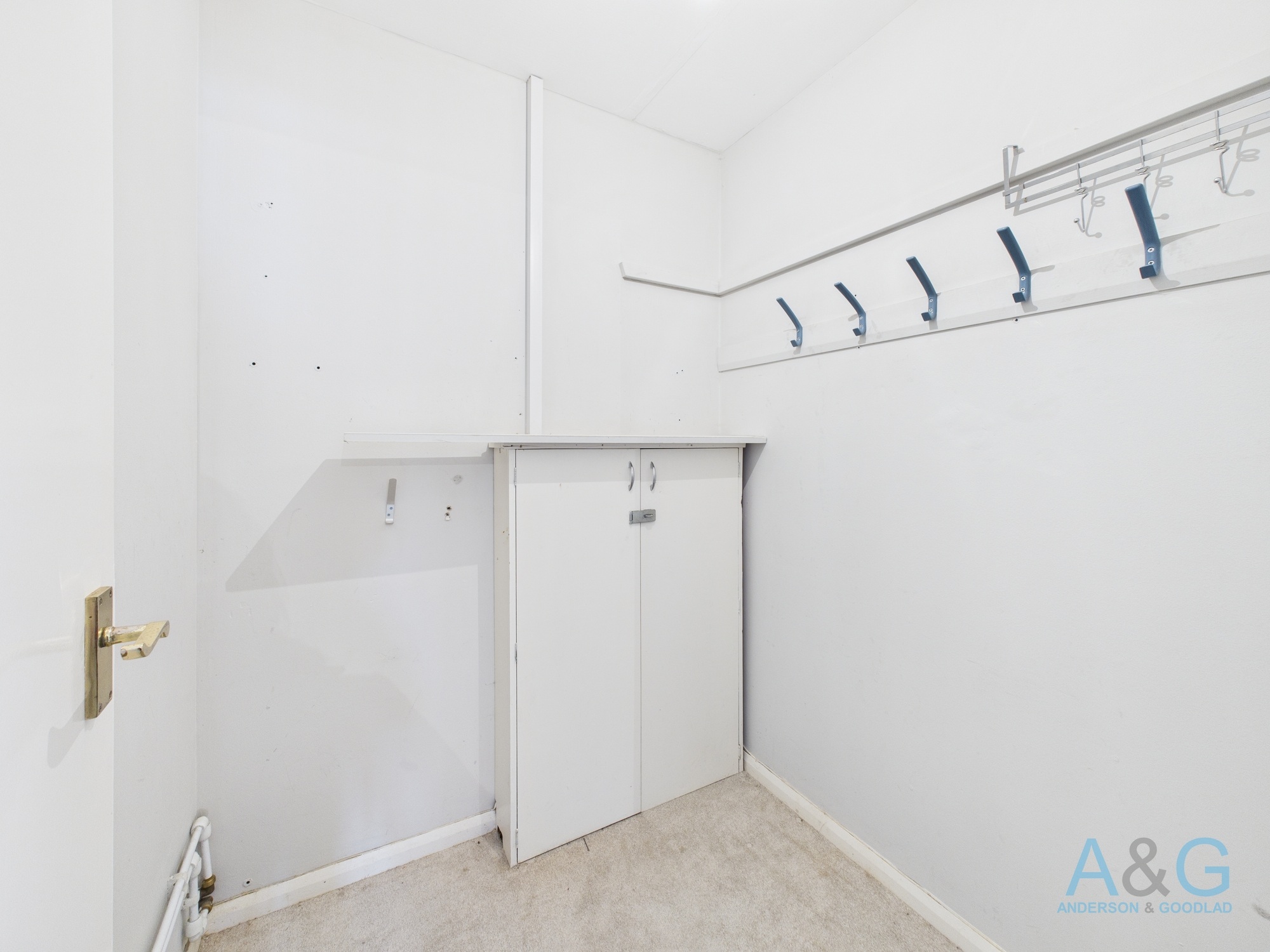 The good-sized Cloakroom contains coat hooks and a cupboard providing access to the electric meter.